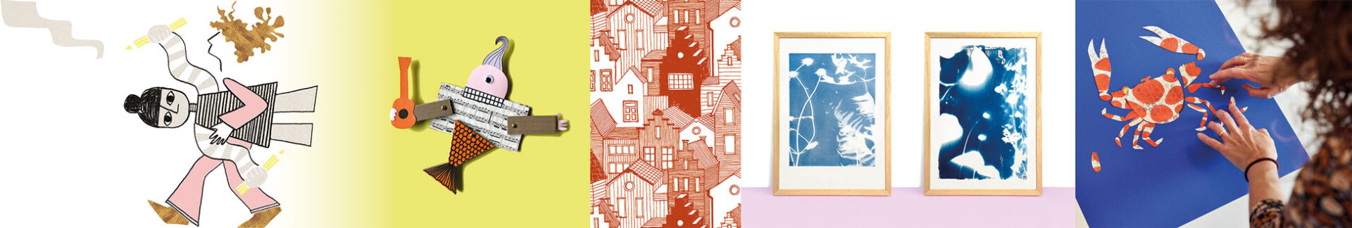 In mijn vrije werk maak ik naast tekeningen, grafisch werk en collages, graag uitstapjes naar keramiek en assemblages, altijd met illustraties als uitgangspunt. Ook deel ik het plezier van maken graag met anderen. Meer weten? Kijk eens bij ‘educatie’.